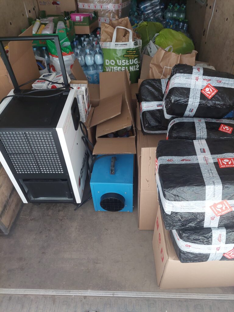 Tym razem nasza pomoc była dopasowana do potrzeb obecnej sytuacji i dostarczyliśmy osuszacz, nagrzewnicę, długie rękawiczki, środki grzybobójcze, worki typu big-bag, środki czystości, artykuły higieniczne oraz wodę pitną i artykuły spożywcze.